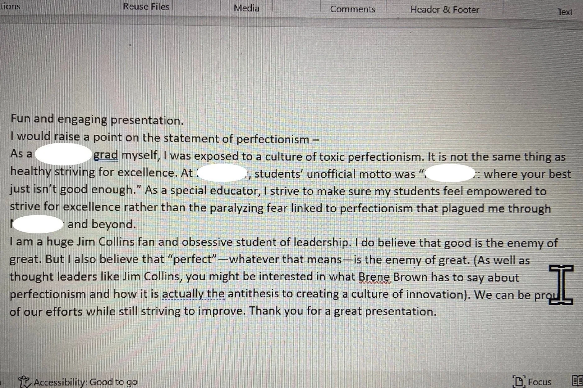 I recently stumbled upon a short post I wrote in 2022, as a response to an alum of my high school who was touting perfectionism as the reason behind The Beatles’ genius as a band, and the success of my high school as an institution. I was lucky that the presentation was virtual, and that through my involuntary shaking I had the presence of mind to at least try to formulate a response (shown below).